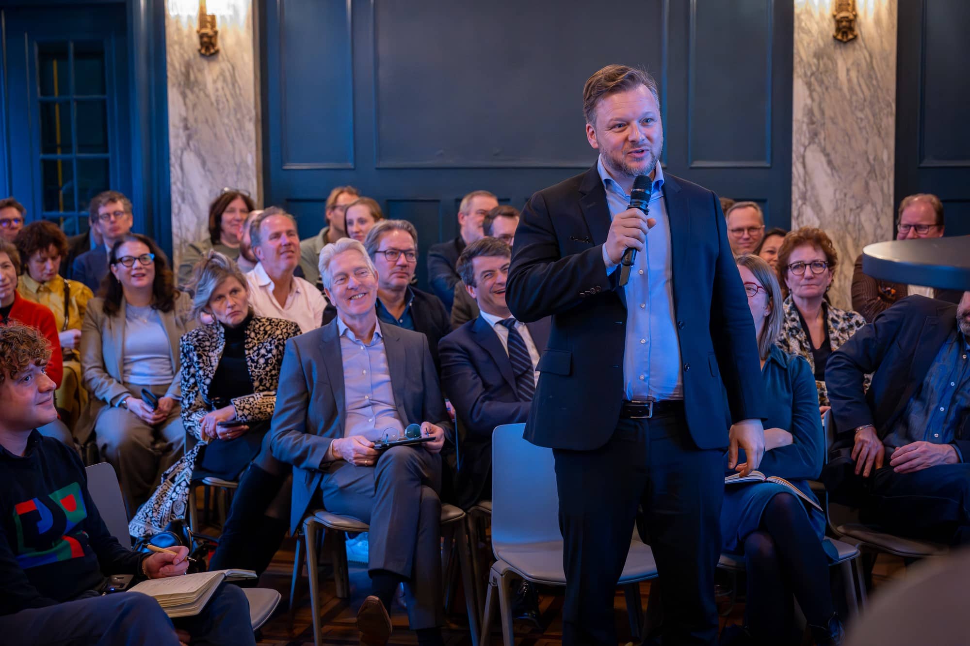 Wat vraagt dit van het openbaar bestuur? Pim verwoordde het credo van de Nationale Jeugdraad helder: ‘Niets over jongeren, zonder jongeren.’ Beleid moet niet óver jongeren worden gemaakt, maar mét hen. Dat betekent dat jongeren actief en vanaf het begin betrokken moeten worden bij beleidsvorming. De NJR heeft daarom een Nationale Jeugdstrategie opgesteld, gebaseerd op onderzoek onder 12.000 jongeren over uiteenlopende thema’s, zoals klimaat, mobiliteit en de digitale wereld. Samen met verschillende ministeries en andere partners voeren zij hierover het gesprek. Juist een integrale aanpak van deze thema’s kan bijdragen aan het versterken van de weerbaarheid van jongeren. Daarnaast wees Pim op zijn betrokkenheid bij het SER-jongerenplatform, waar sterk is ingezet op de invoering van een generatietoets: beleid moet niet alleen worden beoordeeld op de korte termijn, maar ook op de gevolgen voor huidige en toekomstige generaties. Inmiddels ligt de eerste leidraad Toekomstgericht beleid van de overheid er, wat hij als een belangrijke stap ziet.