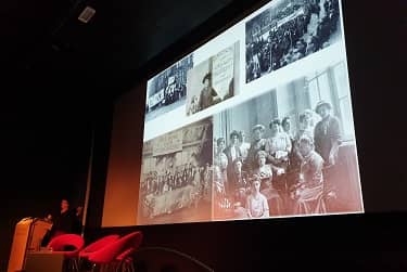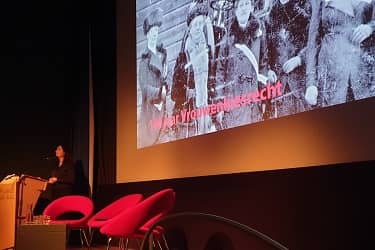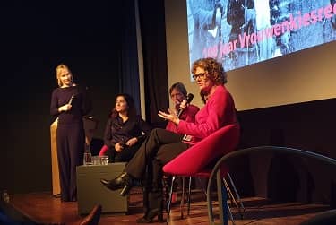 Monique Leyenaar lichtte haar essay over 100 jaar vrouwenkiesrecht toe, over de strijd die voor het kiesrecht is geleverd. Huri Sahin leidde de bijeenkomst, en vertelde over haar eigen ervaring als vrouw in het openbaar bestuur. Géke Roelink lichtte de filmfragmenten toe die in het thema van deze middag zijn uitgekozen door Filmhuis Den Haag.